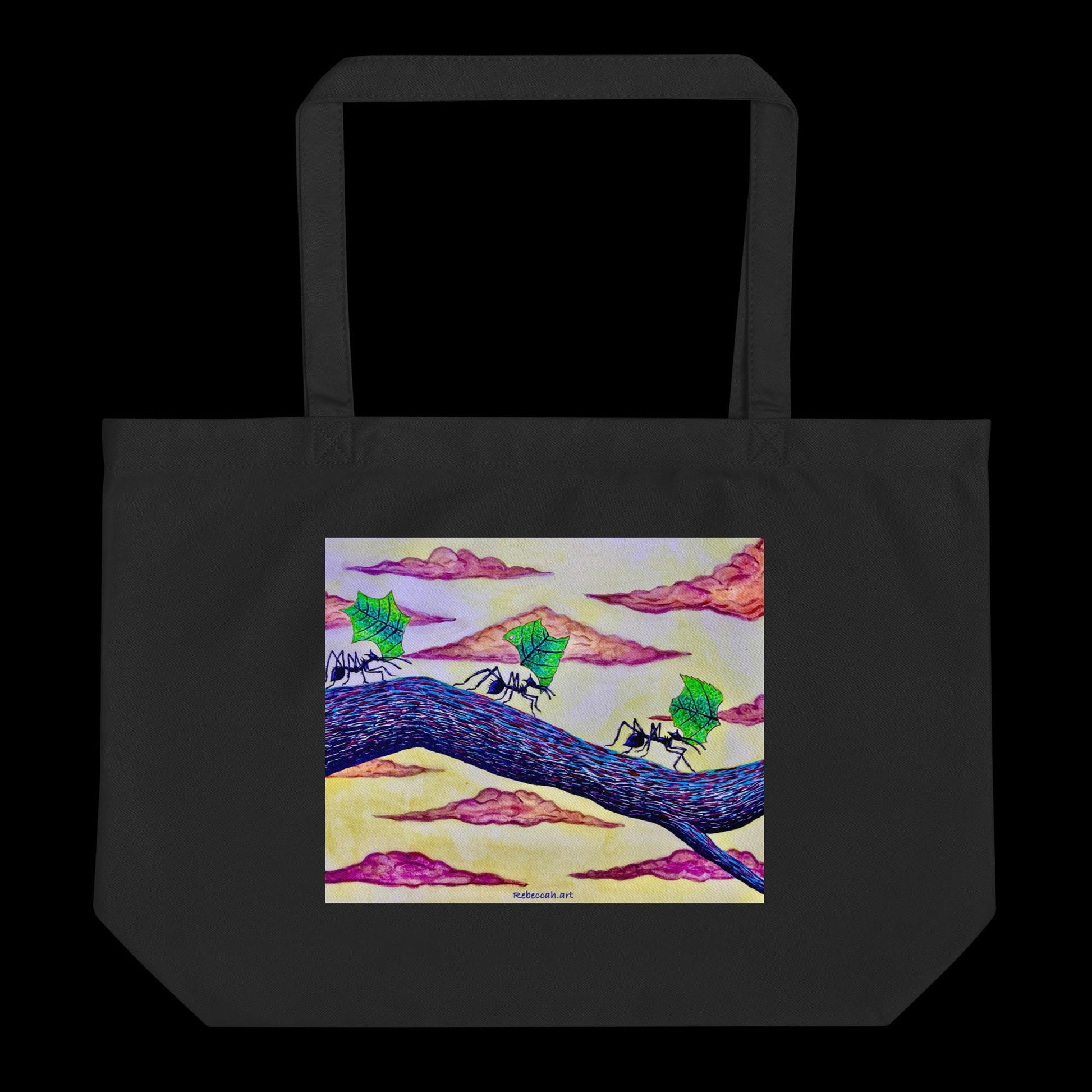 This tote bag illustration is printed from an original painting of leaf cutter ants.