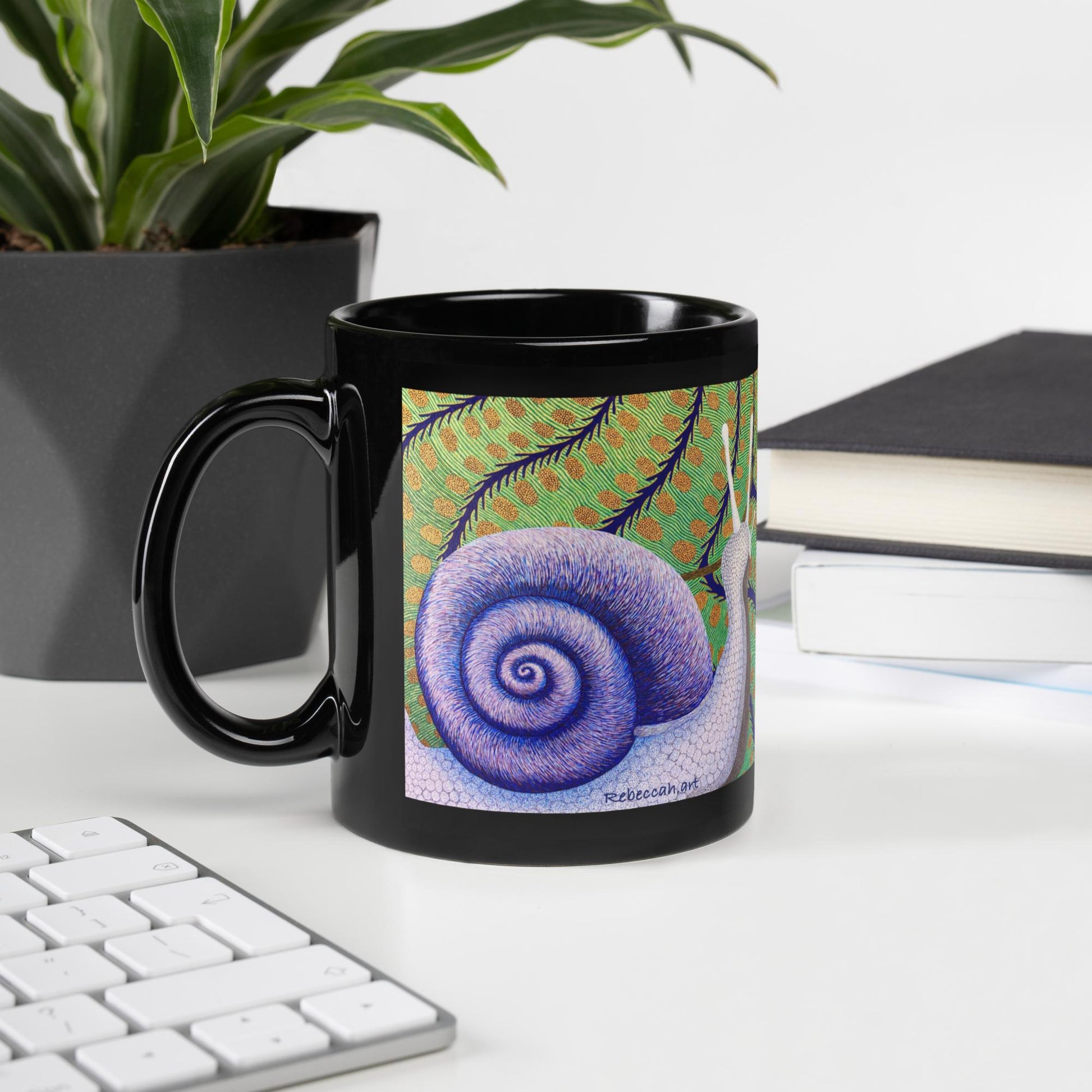 This mug illustration is printed from an original painting of a snail. Metallic acrylic paint on canvas.